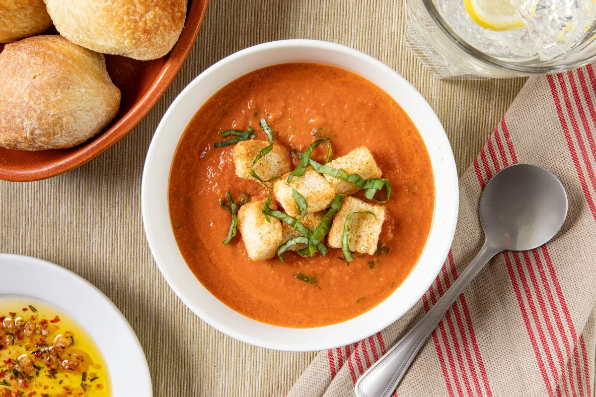 Rich, creamy soup made with fresh ripened tomatoes & garnished with house-made croutons {GS,VT}