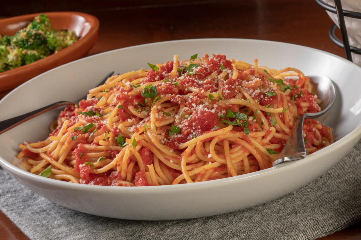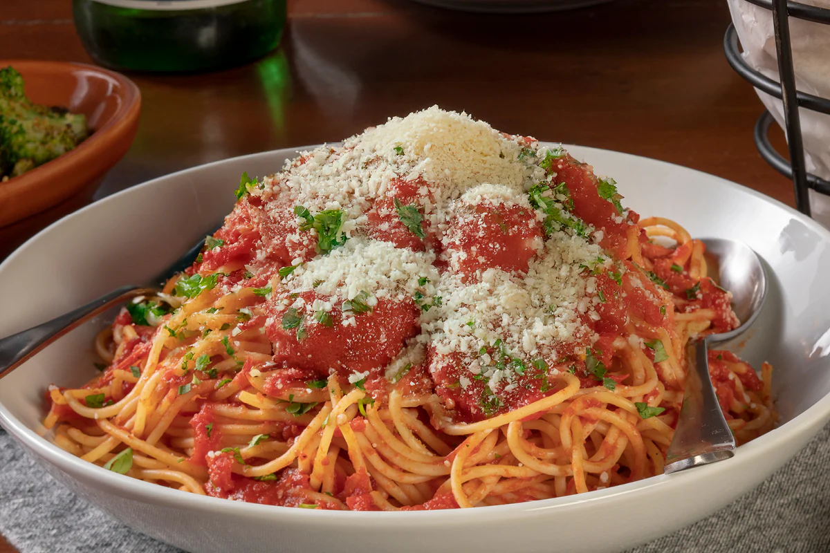 Spaghetti served with house-made pomodoro sauce, served with Insalata & fresh baked rolls. {VT}