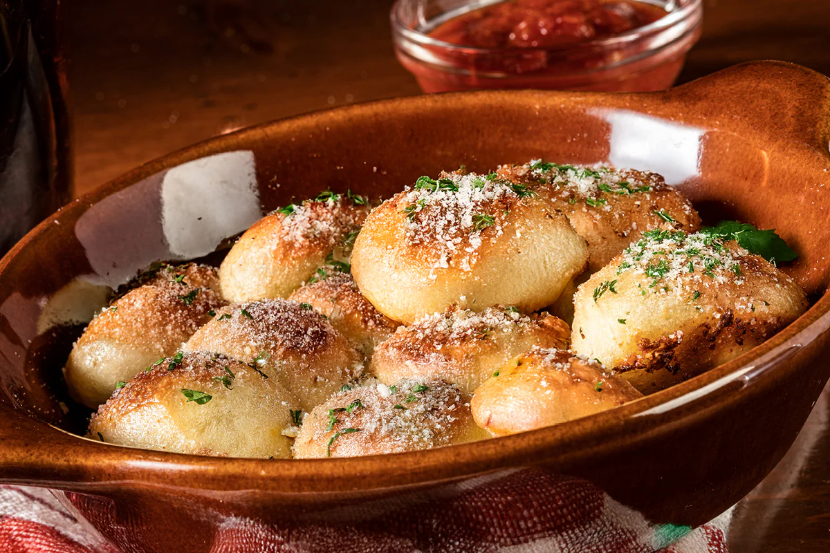 Freshly-baked dough topped with olive oil, fresh garlic, parsley & Pecorino Romano, served with house-made pomodoro {B,VT}