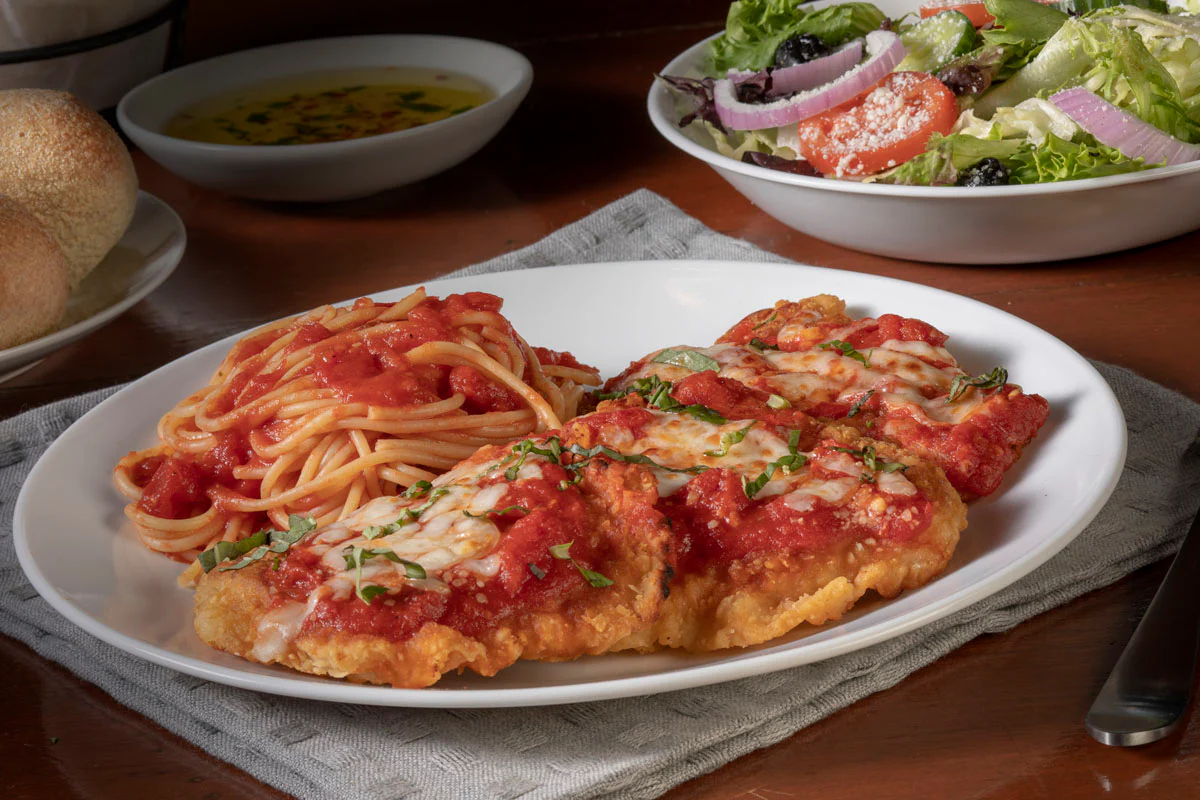 Pecorino Romano, mozzarella, house-made pomodoro sauce & fresh basil, served with spaghetti, served with Insalata & fresh baked rolls