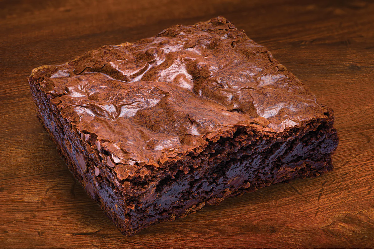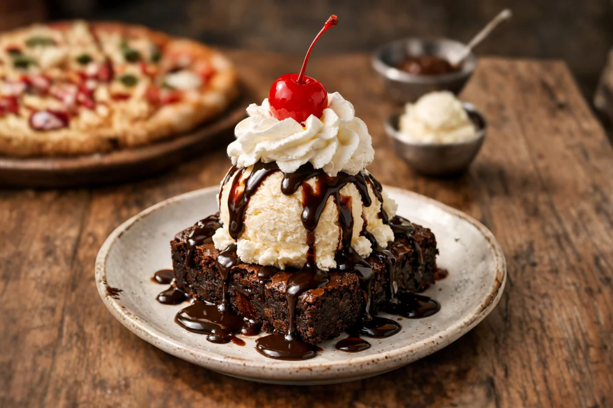 A warm brownie topped with vanilla ice cream, chocolate syrup, whip cream & a cherry