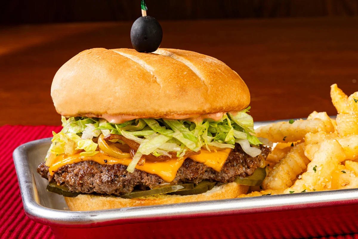 Smashed patty, caramelized onions, pickles, shredded lettuce & house-made burger sauce, served with seasoned fries, Insalata & fresh baked rolls