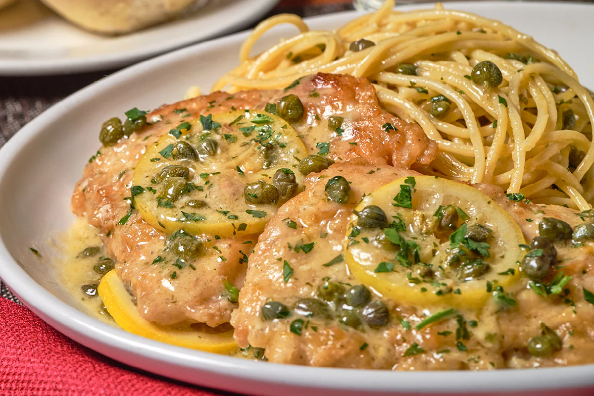 Lemon, capers, creamy white wine sauce, Pecorino Romano & fresh herbs, served with spaghetti