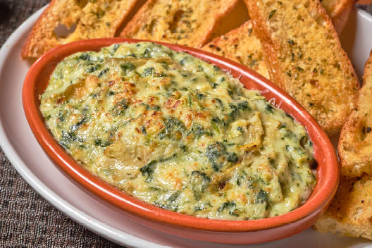 Brick oven-baked creamy spinach & artichokes with mozzarella & Romano cheese. Served with artisan flatbread