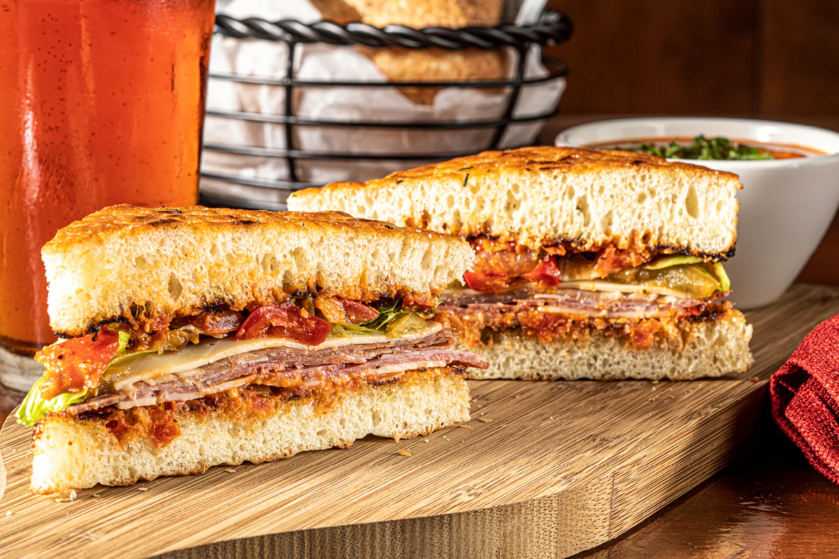 Salami, prosciutto, ham, provolone, red wine vinegar, arugula, tomato, red onion & cherry peppers on a wood fired focaccia, served with seasoned fries, Insalata & fresh baked rolls