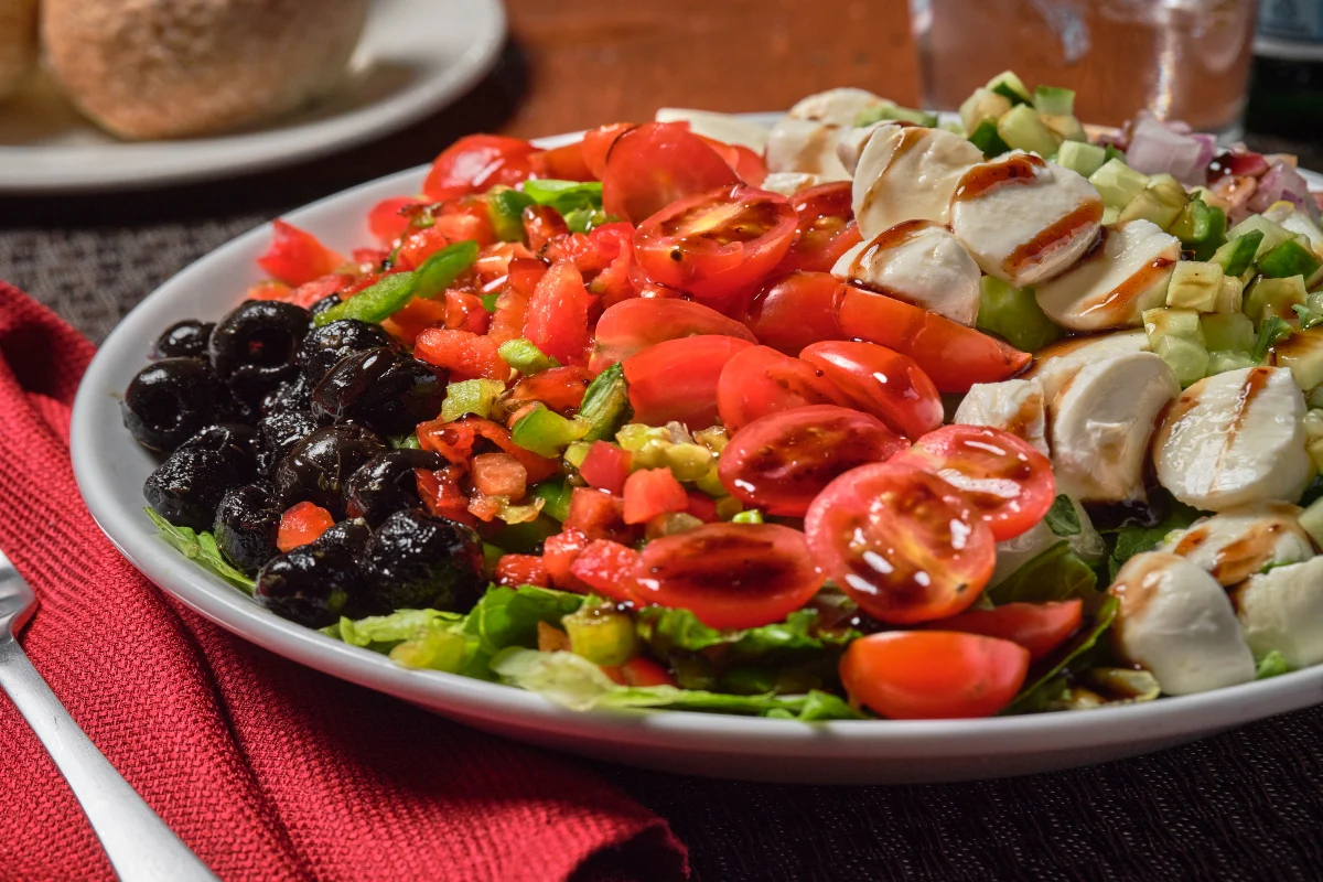 Mixed greens with roasted black olives, diced peppers, cucumbers, red onions, grape tomatoes & fresh mozzarella with balsamic vinaigrette & balsamic fig glaze {GS,VT}