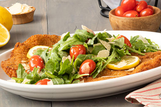 Crispy chicken Milanese topped with sliced Roma tomato and lemon dressed arugula on a wood fired focaccia, served with seasoned fries, Insalata & fresh baked rolls