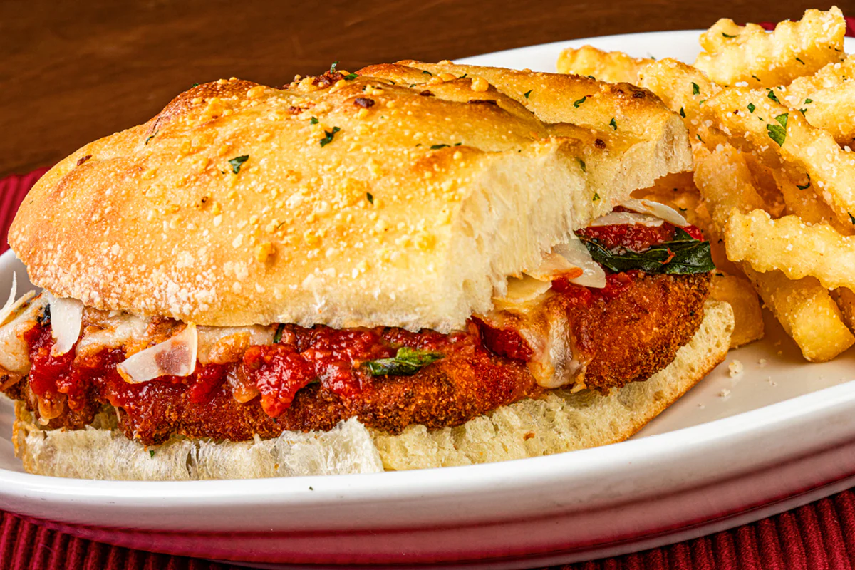 Hand-pounded crispy chicken cutlet, topped with house-made pomodoro, Pecorino Romano, melted mozzarella & hand-torn basil on wood fired focaccia, served with seasoned fries, Insalata & fresh baked rolls