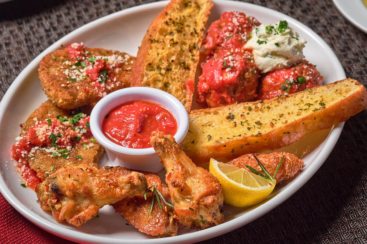 Tuscan Chicken Wings, Mozzarella Fritta {VT} & Meatballs with house-made pomodoro, whipped ricotta & artisan flatbread