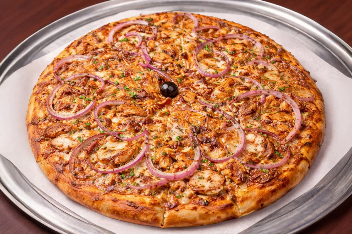 Tangy BBQ sauce, roasted chicken, thinly sliced red onions, Romano & mozzarella