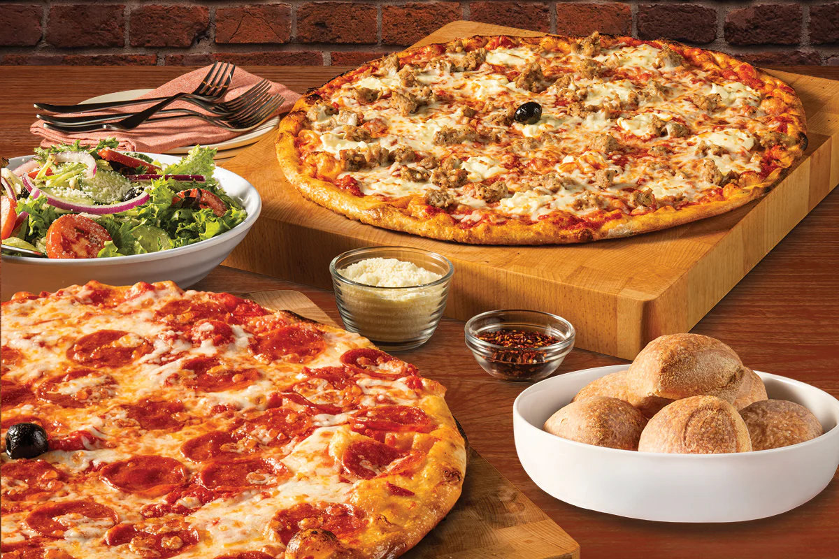 Includes choice of a Salad & 2 Pizzas. Served with our signature rolls! (Feeds 4-6)