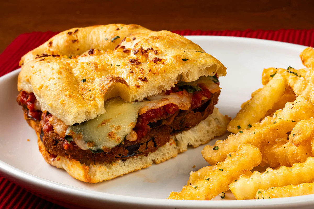 Crispy thick-cut eggplant, topped with house-made pomodoro, Pecorino Romano, melted mozzarella & hand-torn basil on wood fired focaccia, served with seasoned fries, Insalata & fresh baked rolls