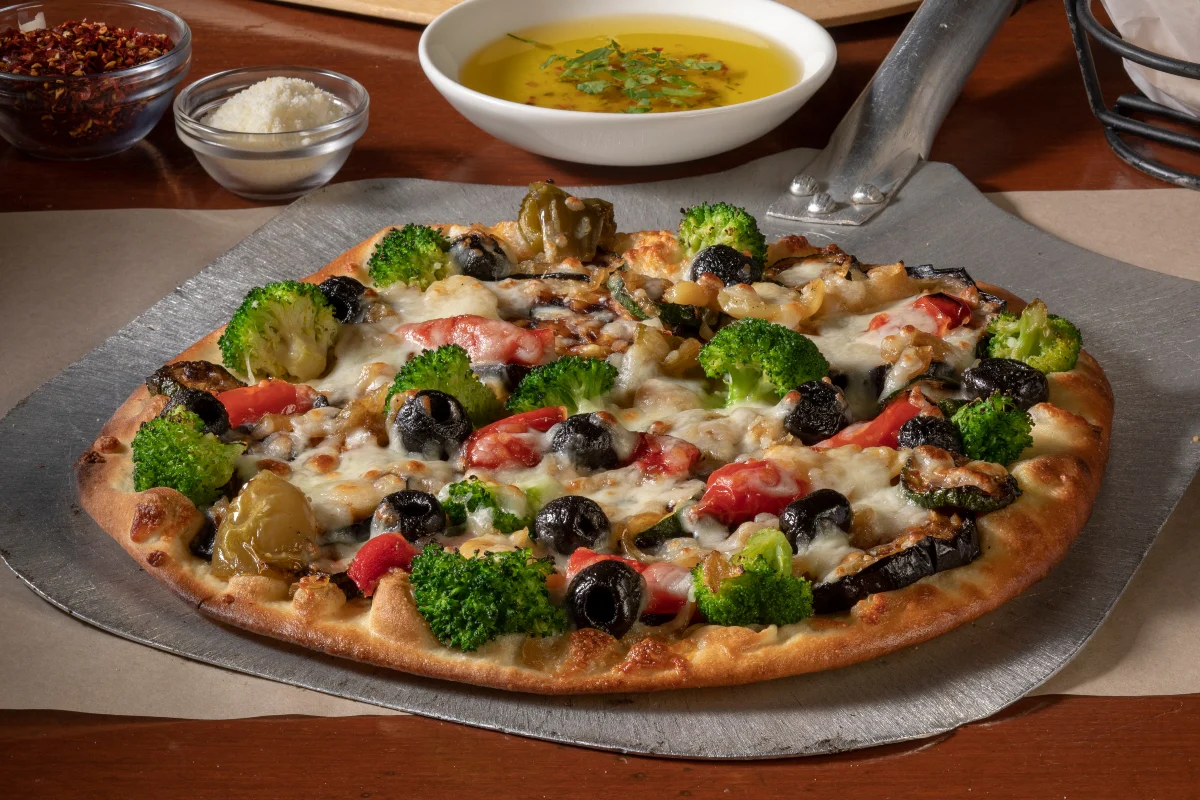 A blend of roasted peppers, eggplant, zucchini, roasted garlic, black olives, pecorino romano, caramelized onions, broccoli, & mozzarella