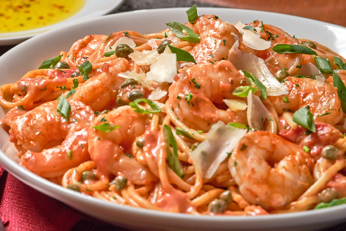 Sautéed shrimp, capers, a hint of hot pepper & tomato cream sauce, tossed with spaghetti & shaved cheese blend.