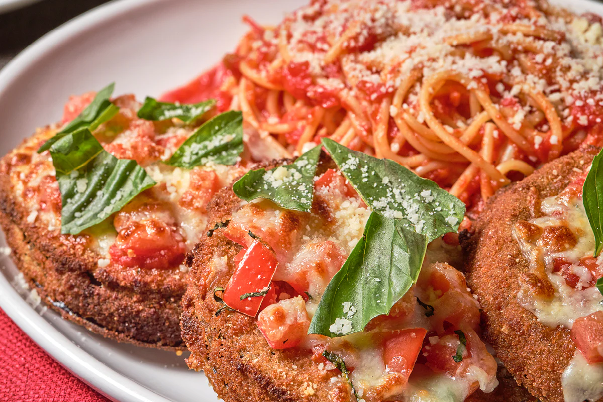 Thick-cut crispy eggplant topped with house-made pomodoro sauce, marinated tomatoes, fresh basil, Pecorino Romano & mozzarella, served with spaghetti