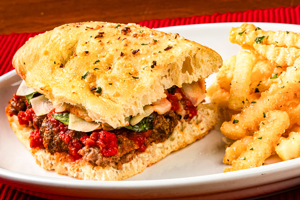 Homemade all-beef meatballs, topped with house-made pomodoro, Pecorino Romano, melted mozzarella & hand-torn basil on wood fired focaccia, served with seasoned fries, Insalata & fresh baked rolls