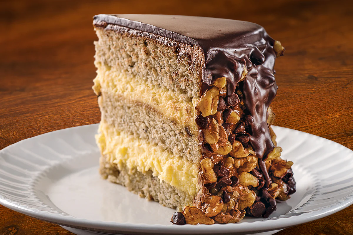 Moist banana cake, rich banana cream, chocolate chips, walnuts & milk chocolate icing - irresistible! {VT}