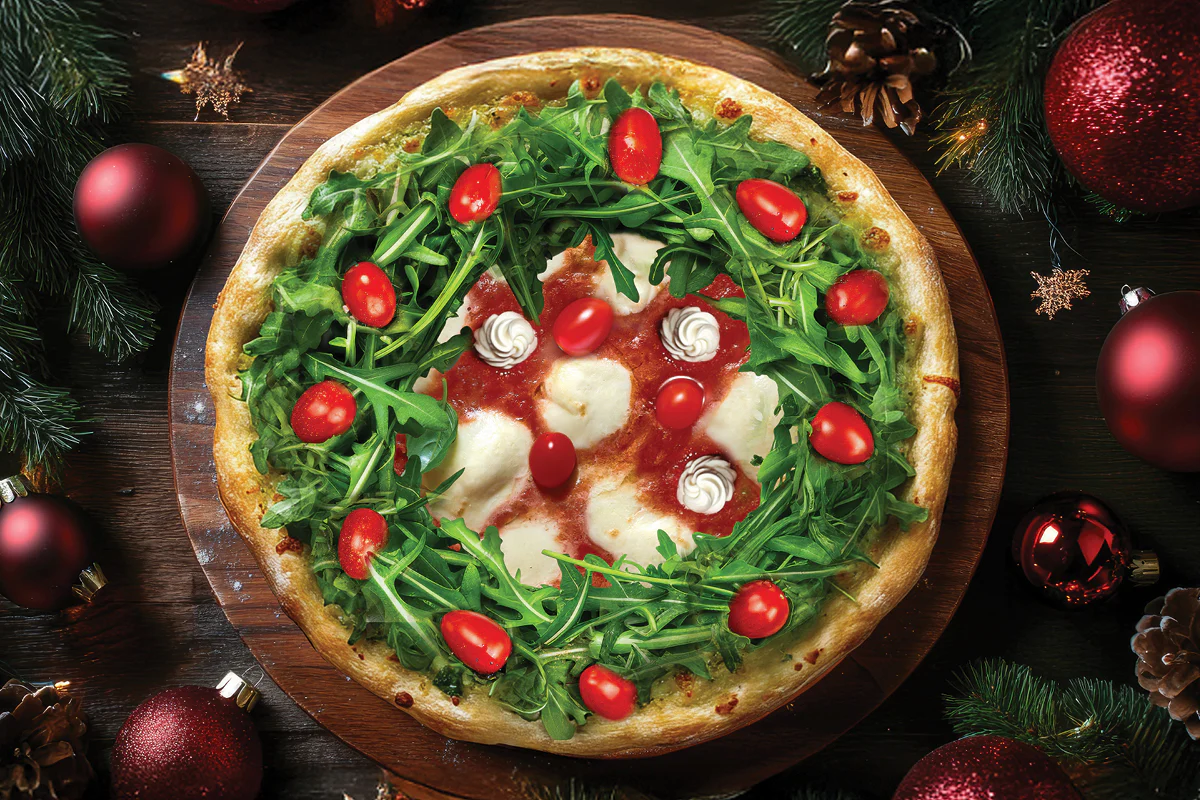 Margherita pizza dressed for the holidays with cherry tomatoes, festive greens & mozzarella, for a merry, picture perfect finish